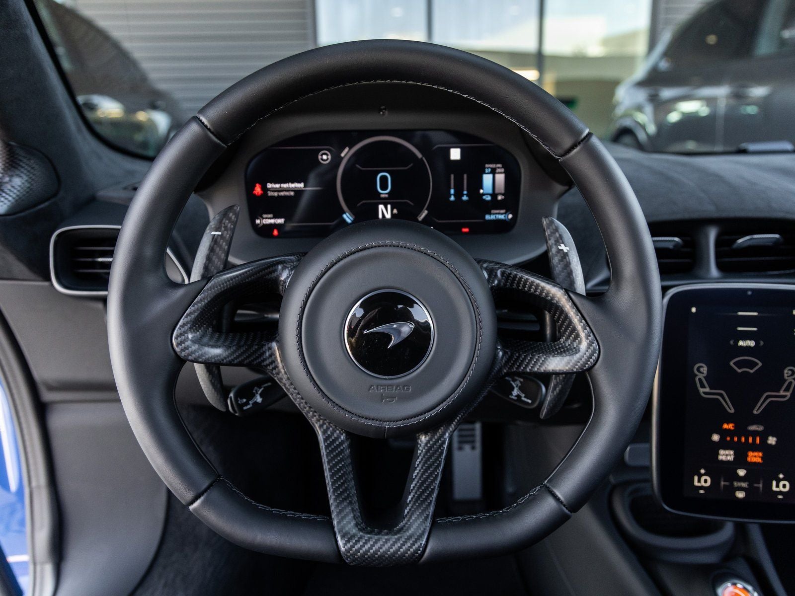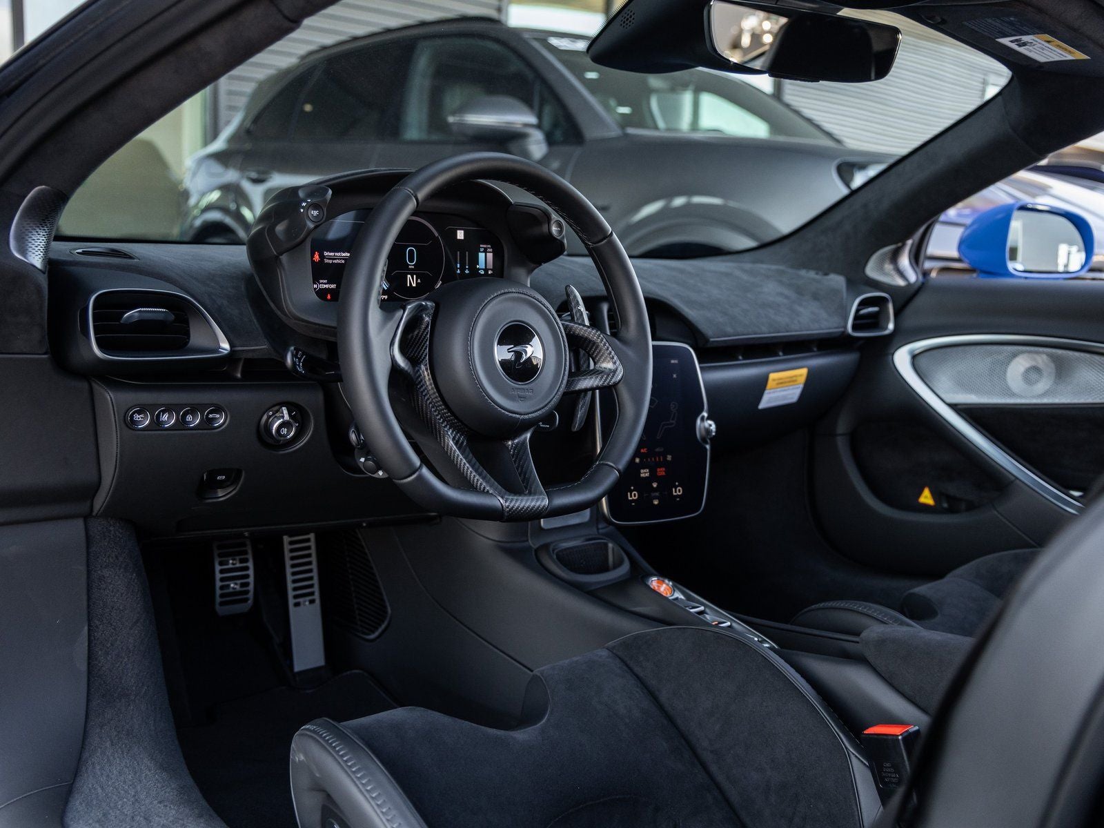 Step inside and the Performance Black/Black interior with Black Accent greets you, exuding a purposeful blend of luxury and motorsport DNA. The ClubSport Seats with Lumbar Adjustment provide exceptional support, while the Carbon Fiber Steering Wheel Clasp & Paddles elevate the tactile driving experience. McLaren Branded Floor Mats, a Printed Owners Manual, and a Car Cover further complement the bespoke ownership experience.