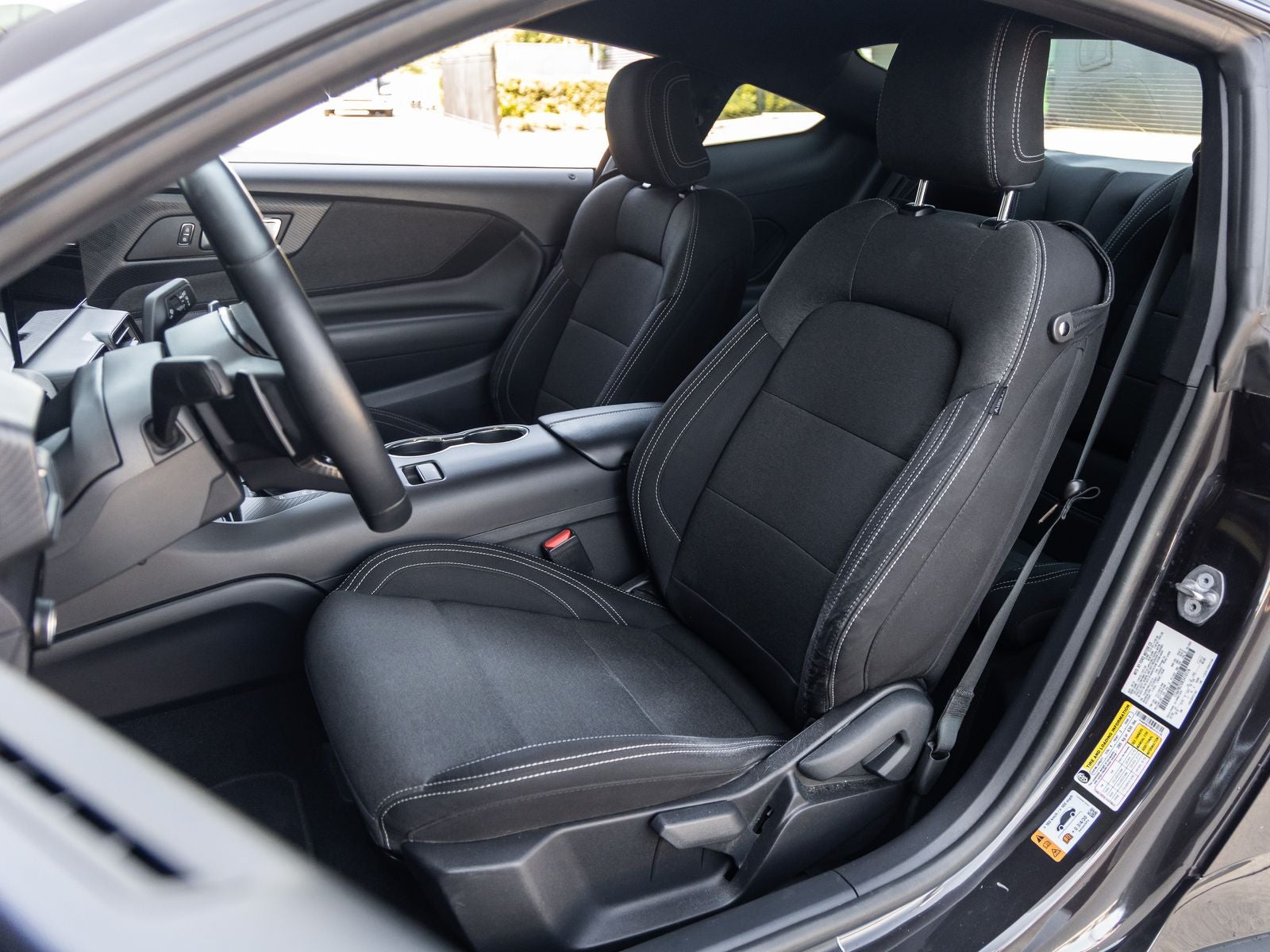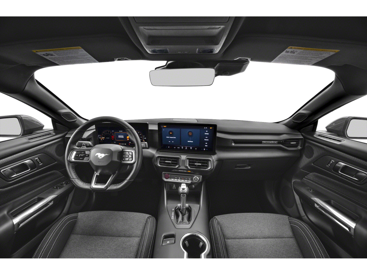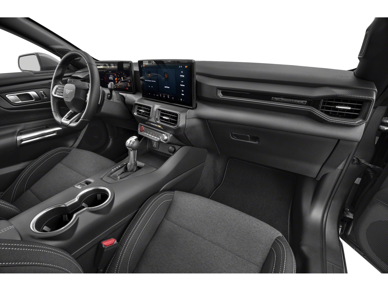 Step inside and the Black Onyx cloth interior greets you, offering a driver-focused cockpit infused with modern technology. A 12.4 digital instrument cluster and 13.2 center touchscreen provide a seamless interface, while the flat-bottom leather-wrapped steering wheel and sport seating ensure an engaging driving experience. With features like SYNC4, selectable drive modes, and FordPass Connect, this Mustang blends classic performance with contemporary convenience.