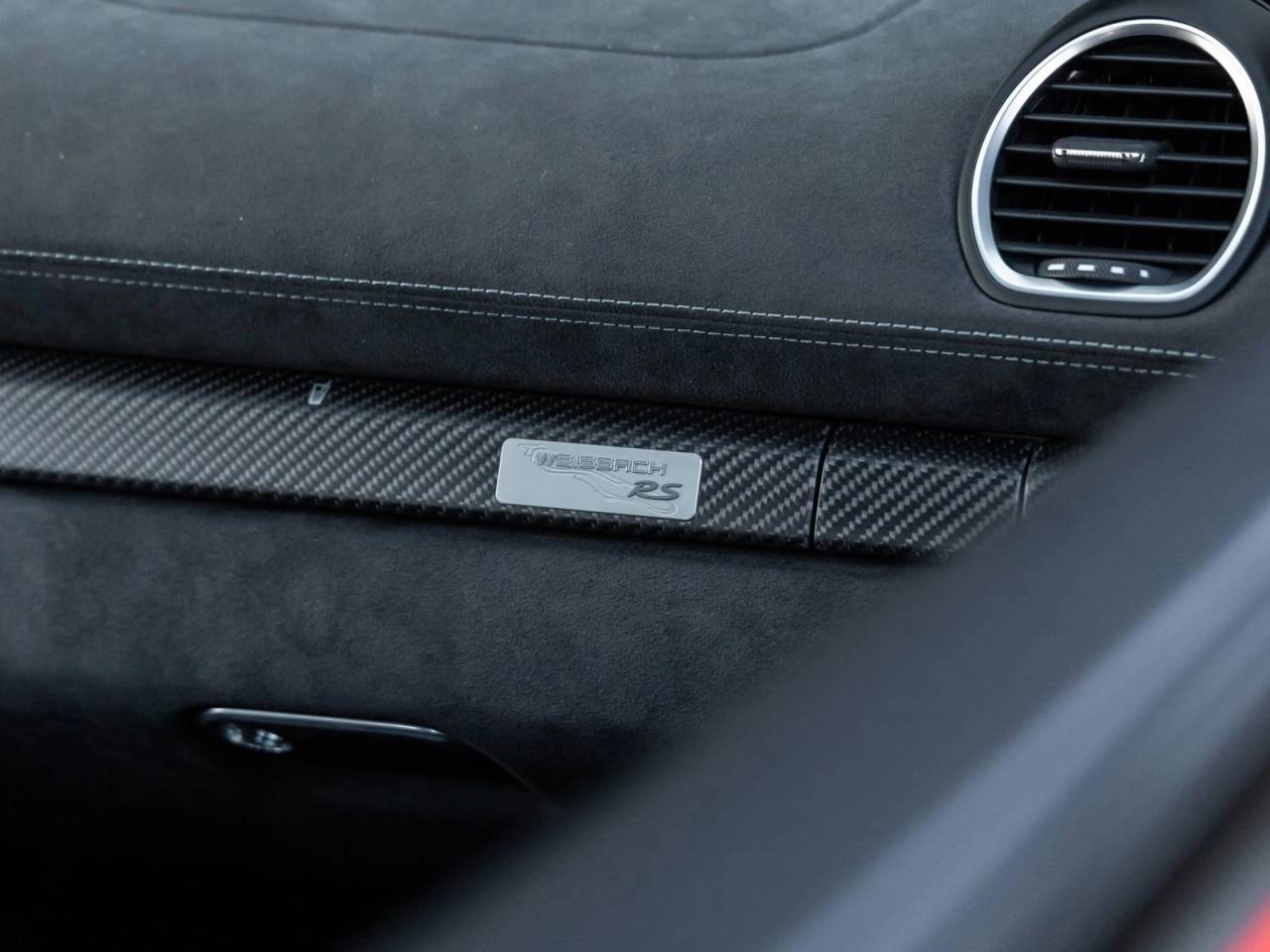 The 718 Cayman GT4 RS stands as a beacon of design and performance, its Guards Red exterior not just a color, but a badge of honor that reflects Porsche's illustrious racing heritage. Adorned with the Weissach Package, Carbon Fiber Window Triangle Trims, and a Front Trunk Lid and Wing in Exposed Carbon Fiber, it presents an unmistakably aggressive and lightweight-focused stance. LED Headlights including Porsche Dynamic Light System (PDLS) and High Gloss Black Brake Calipers further enhance its commanding presence on the road and track alike.