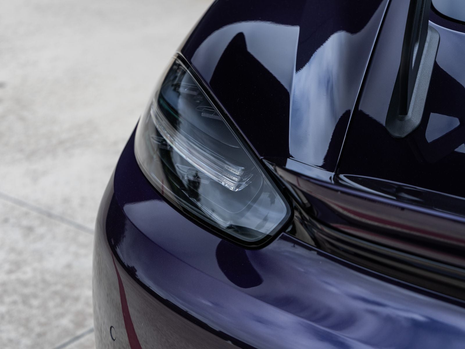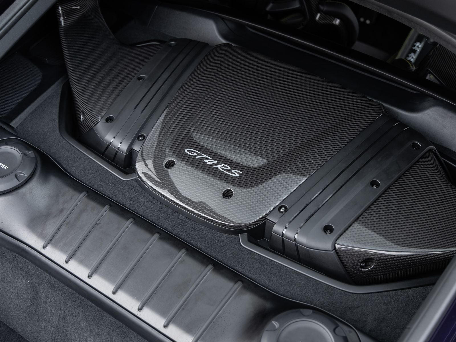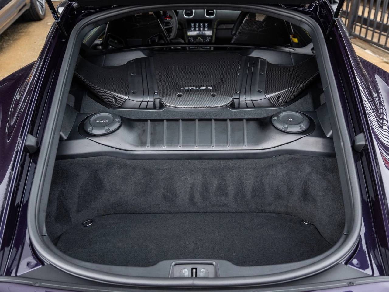The GT4 RS stands as a beacon of design and performance, its Paint to Sample Violametallic exterior not just a color, but a badge of exclusivity that reflects Porsche's relentless pursuit of perfection. Adorned with Wheels Painted in Satin Neodyme and LED Headlights including Porsche Dynamic Light System (PDLS), it presents an unmistakably aggressive stance. The Weissach Package, along with exposed carbon fiber elements including the front trunk lid and rear wing, reinforces its motorsport pedigree, while PCCB (Porsche Ceramic Composite Brakes) and Brake Calipers in High Gloss Black elevate both performance and visual drama.